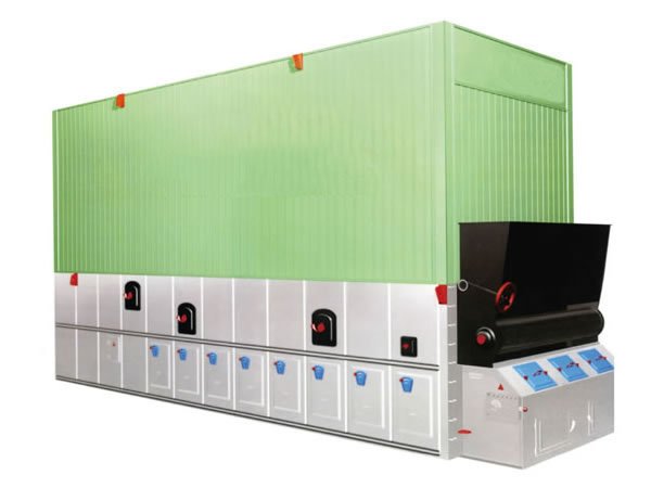 1.YWL型系列燃煤(生物質)臥式有機熱載體爐為組裝式強制循環鏈條爐排鍋爐。鍋爐本體前部為爐膛輻射受熱面,由密排的雙方形盤管構成;后部為對流;中刷受熱面,由蛇形管束組成。鍋爐由上部本體和下部鏈條爐排組成,工地現場組合。空氣預熱器布置在鍋爐后面。燃燒生成的高溫煙氣在爐膛被吸走部分熱量,經轉向煙室進入對流受熱面換熱,出鍋爐在空氣預熱器加熱進鍋爐燃燒的空氣,再經除塵器由引風機將煙氣送至煙囪排入大氣。